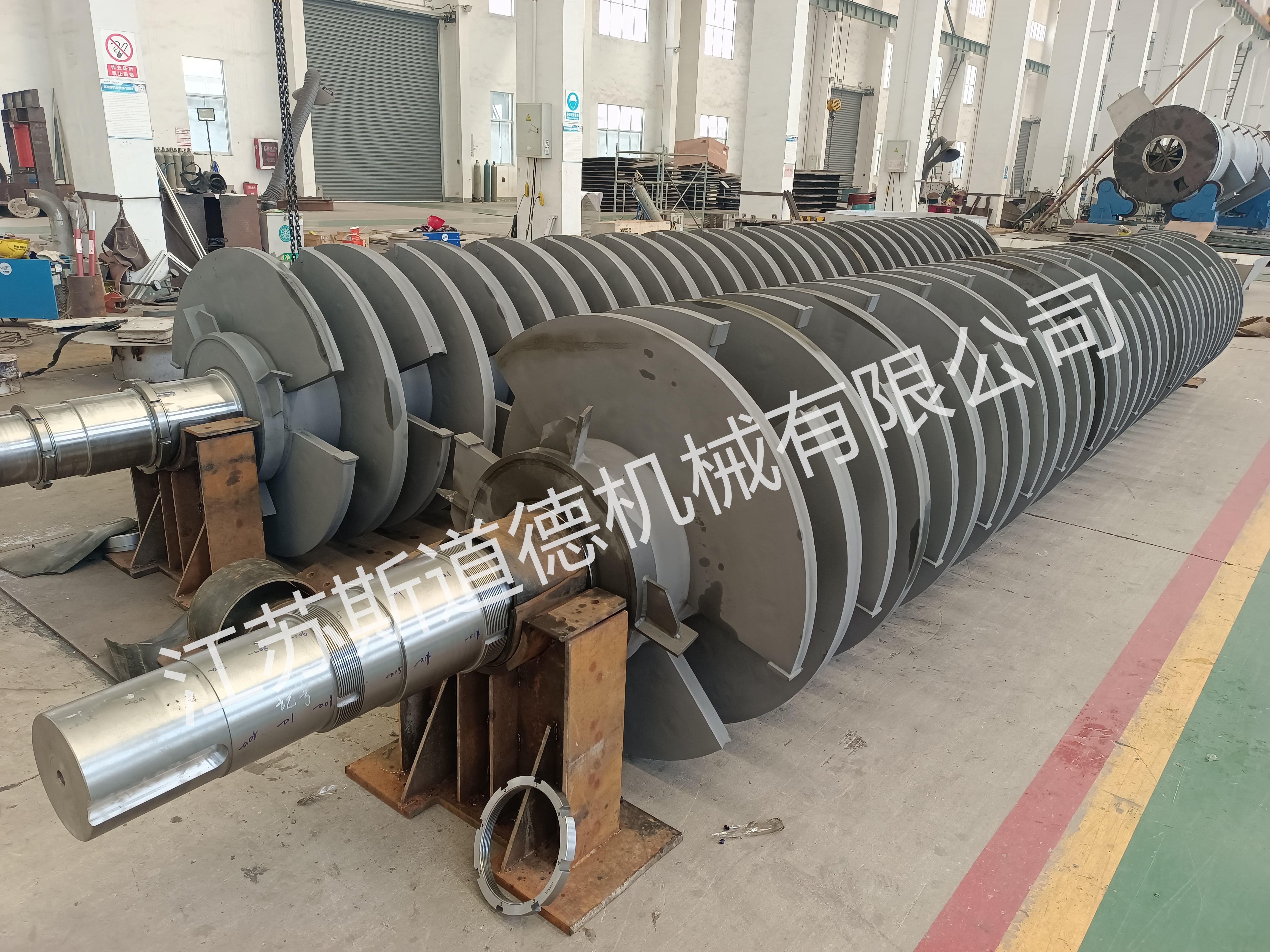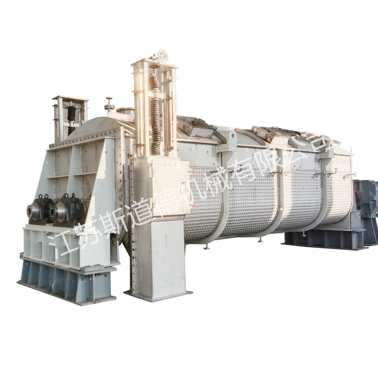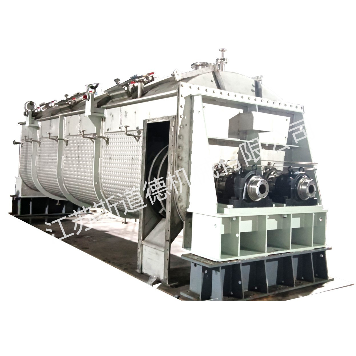JYD型槳葉干燥機(jī)不僅外殼可進(jìn)行加熱,同時(shí)內(nèi)部轉(zhuǎn)子也進(jìn)行加熱,大大增加干燥面積,提高熱效率,確保物料徹底干燥,本機(jī)在帶有夾套的殼體內(nèi)有兩根或多根相互鑲嵌的轉(zhuǎn)子組成,各轉(zhuǎn)子上裝有多件加熱用的扇形空心槳葉。加熱介質(zhì)通過(guò)安裝在回轉(zhuǎn)軸端部的旋轉(zhuǎn)接頭進(jìn)入中空回轉(zhuǎn)軸及槳葉,傳熱干燥后,再通過(guò)旋轉(zhuǎn)接頭將冷凝水排出機(jī)外,該設(shè)備具有以下特點(diǎn):